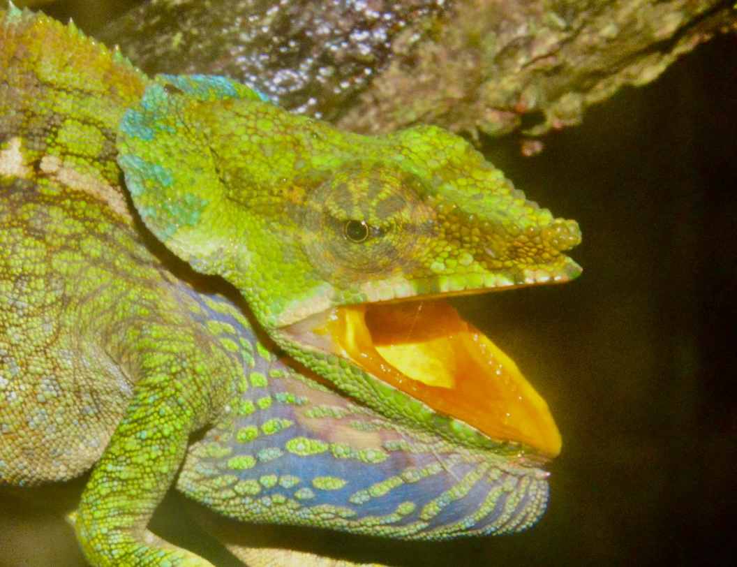 It is important to note that chameleons are practically deaf. Their auditory system is rudimentary, lacking external ear openings and tympanic membranes, and they rely primarily on vibration detection rather than true hearing. The large occipital lobes, which in profile resemble "elephant ears," do not participate in auditory processing in any sense. Instead, these lobes are visual structures, reinforcing the dominance of sight in chameleon biology. This anatomical reality underscores why visual signals play such a central role in communication, species recognition, and defense.