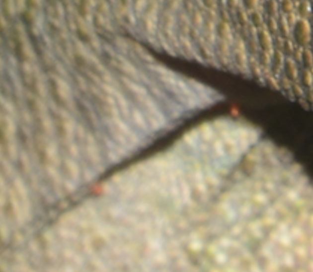 Mite bites are small and often inconspicuous, with discoloration restricted to the immediate vicinity of the bite. Because mites are much smaller than mosquitoes and do not chemically treat the bite site, lesions are subtle and sometimes overlooked (Arnold, 1986; Salvador et al., 1999). In contrast, mosquito bites produce larger necrotic lesions and black-colored markings due to tissue trauma and the injection of anticoagulatory and anesthetic substances. Garcia et al. (2023) documented mosquito-induced color changes in chameleon skin, noting that these lesions are persistent and melanized. Due to their size the damage of the host skin is more extensive than mite bites.