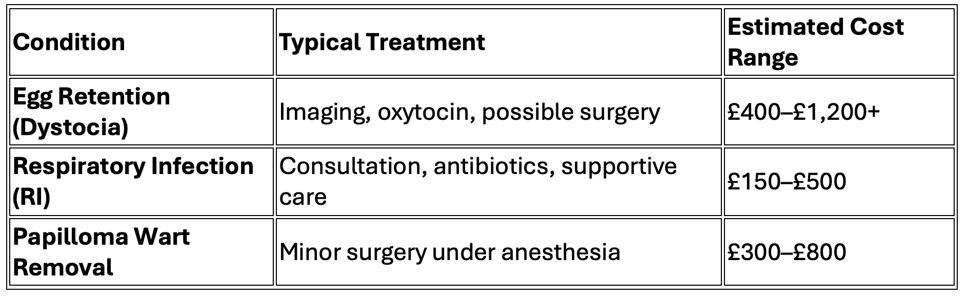 Scenario: If 2–3 animals develop serious conditions (e.g., egg retention, RI, surgery), costs could easily exceed £3,000–£4,000. Insurance would cover these, but premiums for 10 animals are substantial. Over 5 years, you spend £7,200 in premiums. If major health issues occur across the group, insurance may balance or save money. If the group remains healthy, premiums outweigh direct costs.