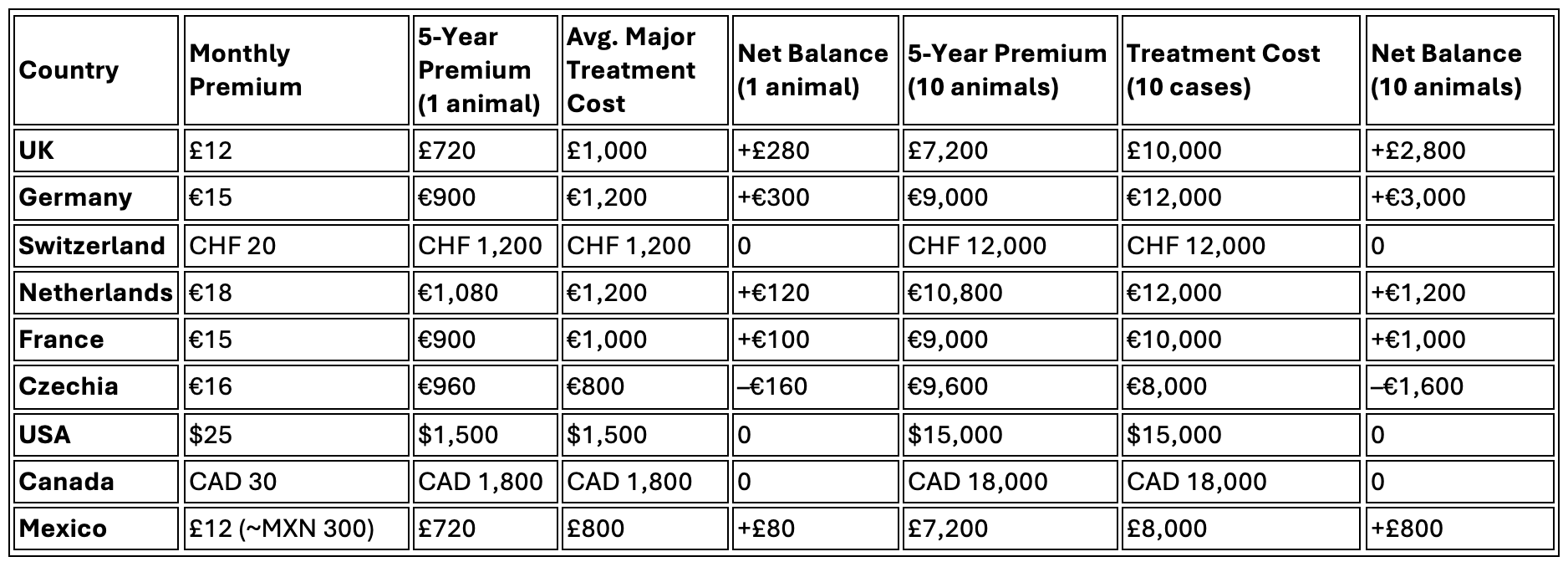 - For a breeding group of 10: Insurance can be protective in UK/Germany if multiple animals fall ill, but premiums are heavy. In Czechia, premiums outweigh likely costs. Self-funding may be more rational for large groups unless frequent health issues are expected.