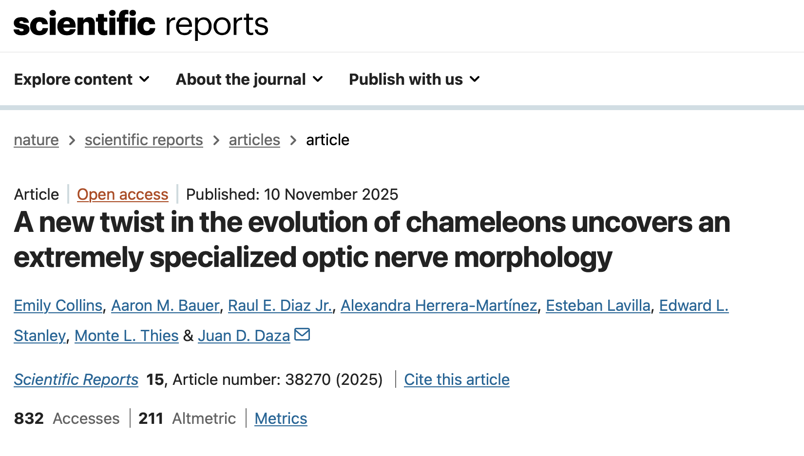 Collins, E., Bauer, A.M., Diaz Jr., R.E., Herrera-Martínez, A., Lavilla, E., Stanley, E.L., Thies, M.L., & Daza, J.D.(2025). A new twist in the evolution of chameleons uncovers an extremely specialized optic nerve morphology. Scientific Reports, 15, Article 20357. https://doi.org/10.1038/s41598-025-20357-3