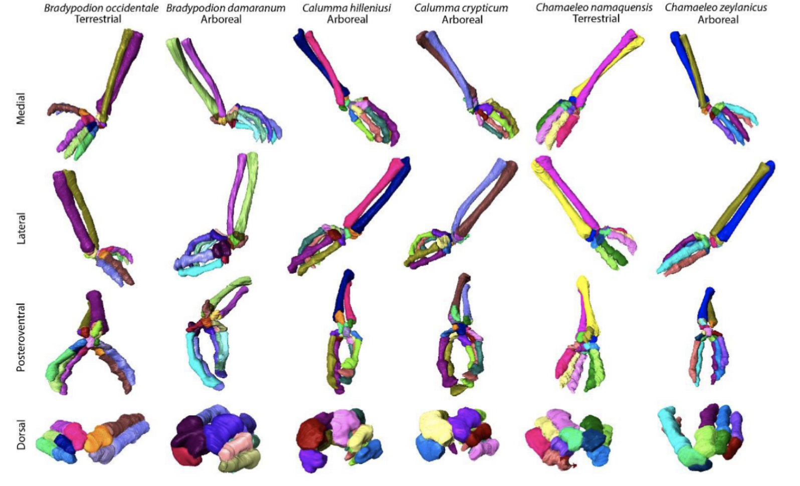 In her 2023 honors thesis, Ecological and evolutionary drivers of chameleon forelimb variation, Ellie M. Schley investigates how forelimb morphology in chameleons reflects their ecological niches. Using high-resolution micro-CT scans, she analyzed the forearms and hands of 12 chameleon species—carefully selected to represent both arboreal and terrestrial lifestyles across multiple genera.
