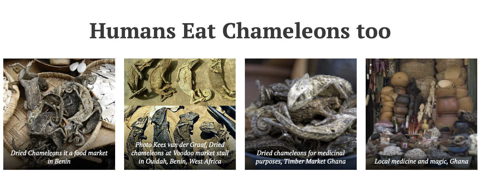 In Cameroon, rural populations include chameleons in their diets when protein is scarce. Hunters capture them during foraging trips, and they are cooked alongside staple foods.