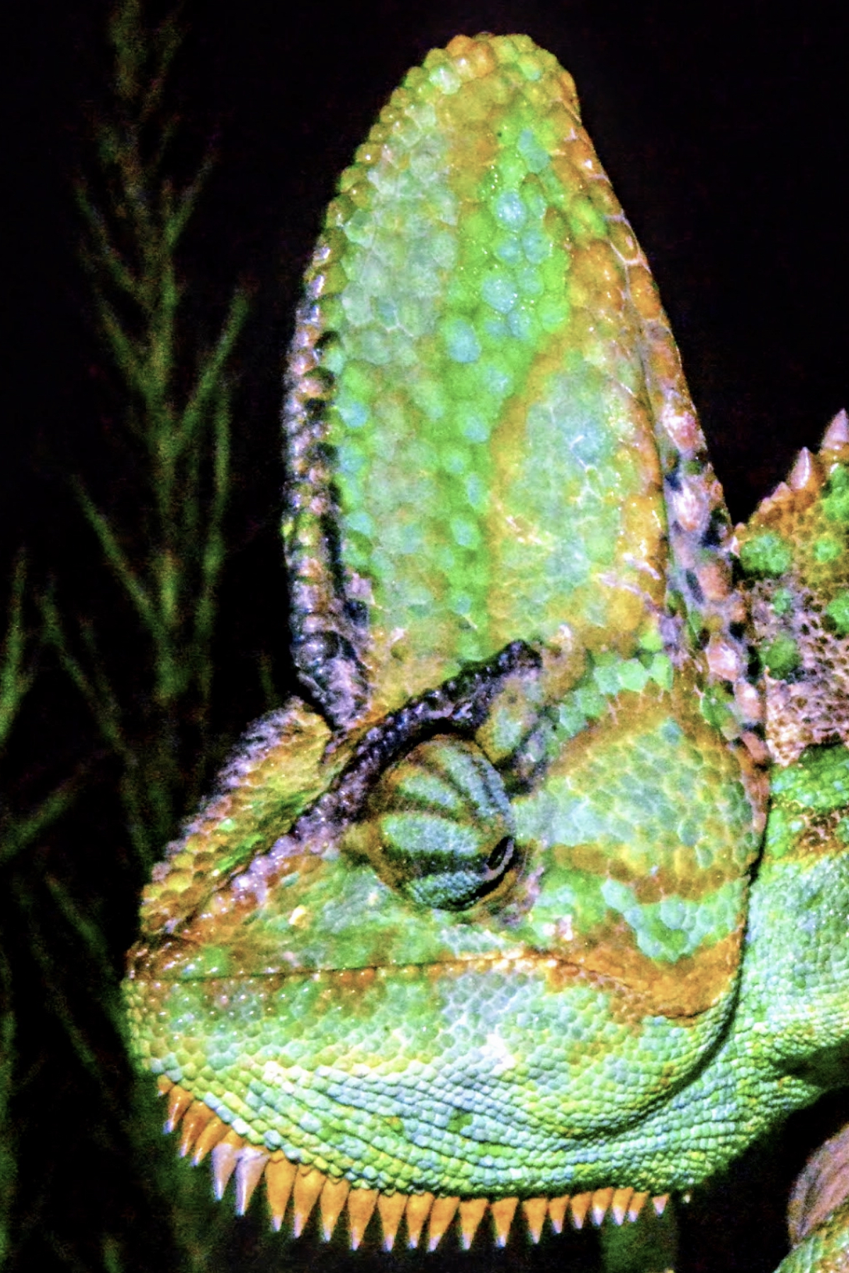 Chameleon casques are not used for water storage. In C. calyptratus, the high casque is a product of character displacement and functional biomechanics, not hydration. True care means understanding anatomy and evolution—not inventing fantasy.