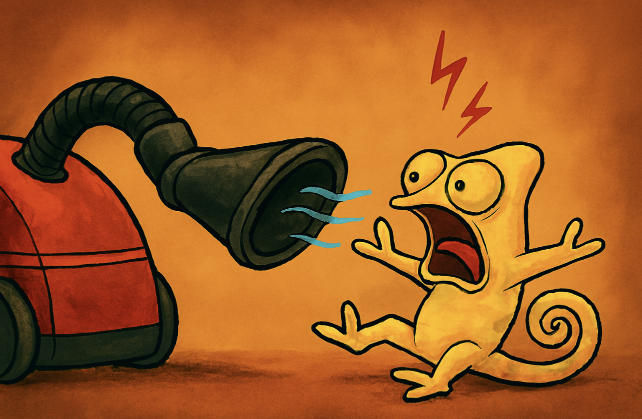 Free roaming indoors is not enrichment. It's a gamble — and one that rarely ends well for the chameleon.
