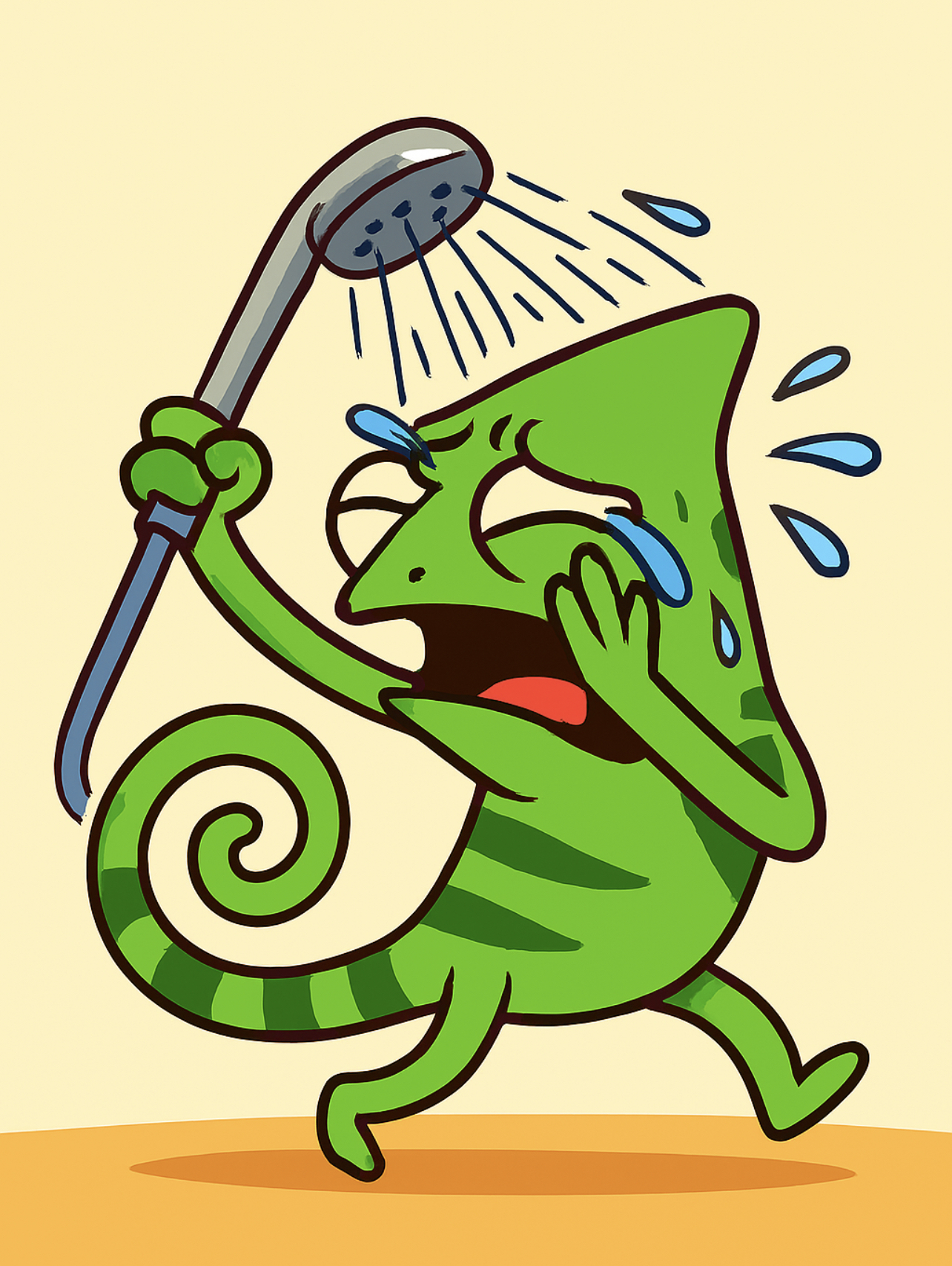 When chameleons bulge or rotate their eyes during misting, it is not a cleansing act. It is a defensive response to discomfort caused by hypotonic water entering the orbital cavity. The eye movements attempt to expel foreign fluid and restore pressure balance—not to rinse the eye.