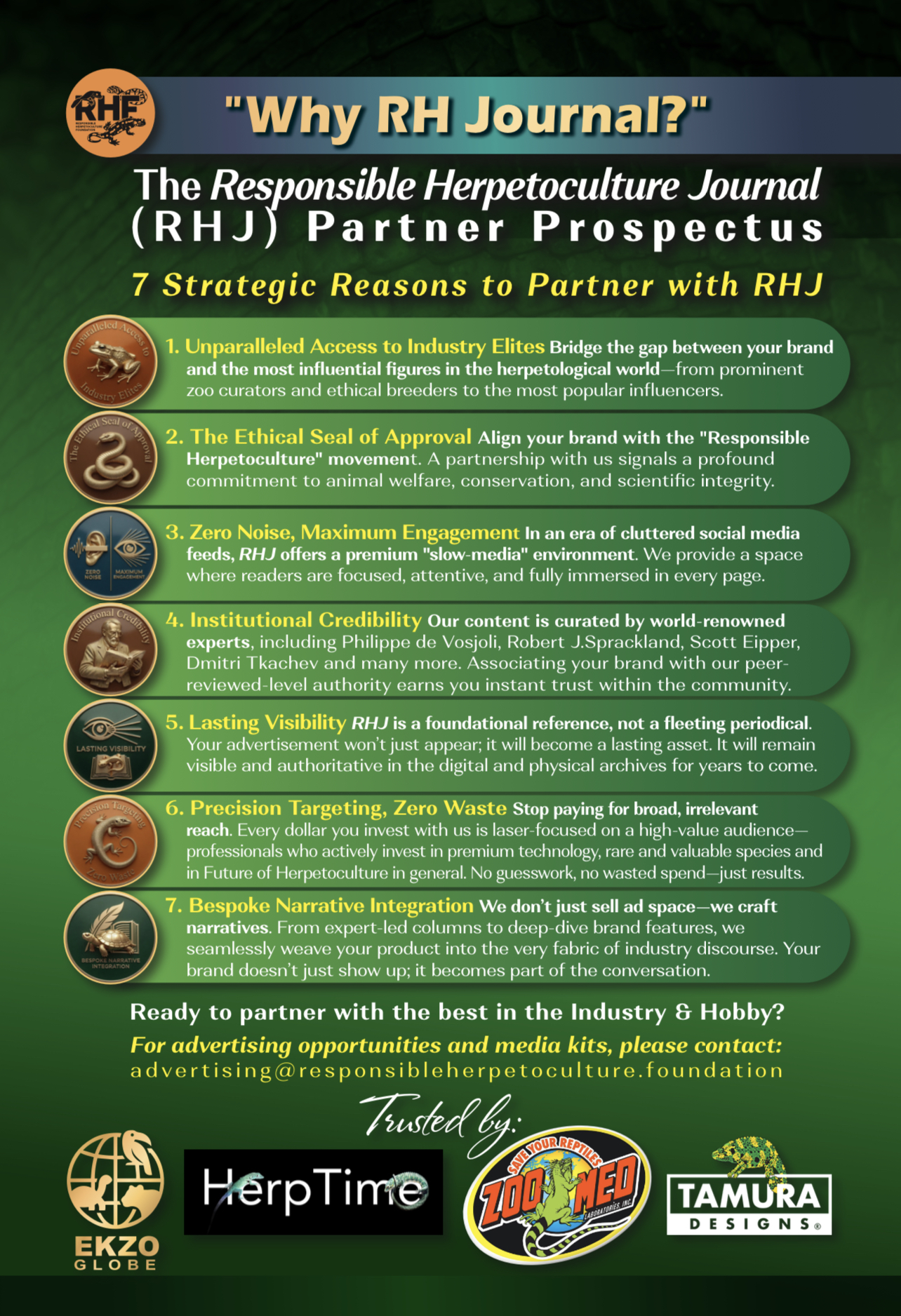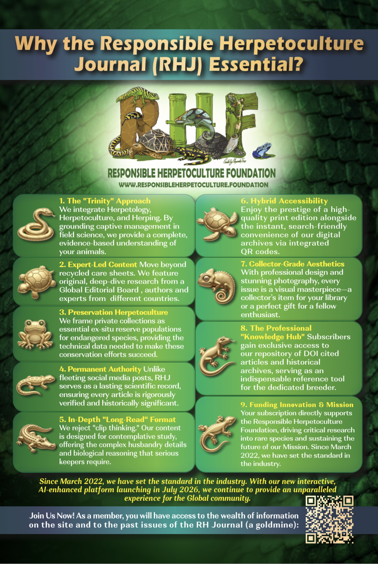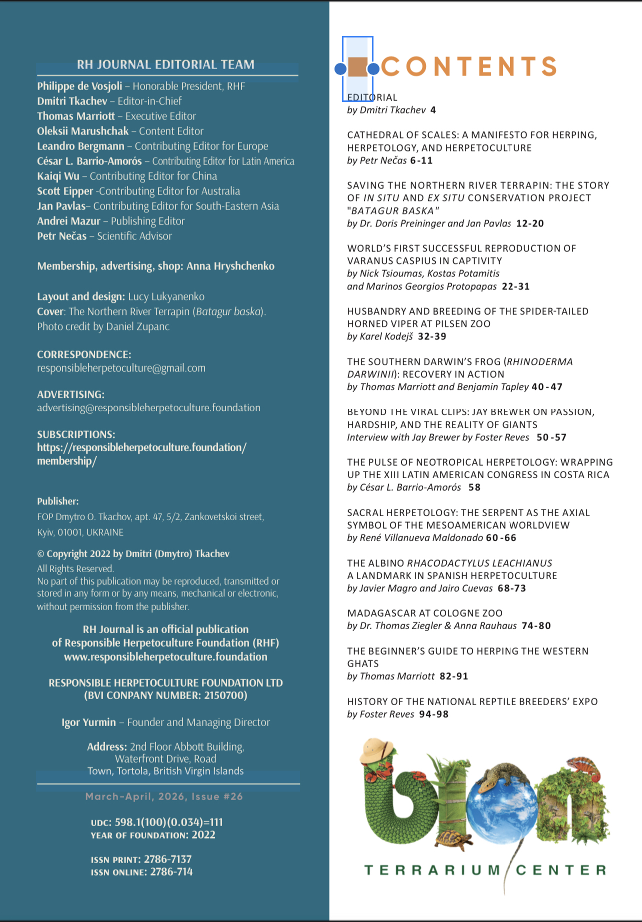 The Responsible Herpetoculture Journal (RHJ), published by the Responsible Herpetoculture Foundation, has quickly become one of the most respected platforms for reptile and amphibian keepers, researchers, and conservationists. Comparable in scope to the earlier Vivarium magazine, RHJ distinguishes itself by its international reach and its emphasis on responsible practices in herpetoculture.