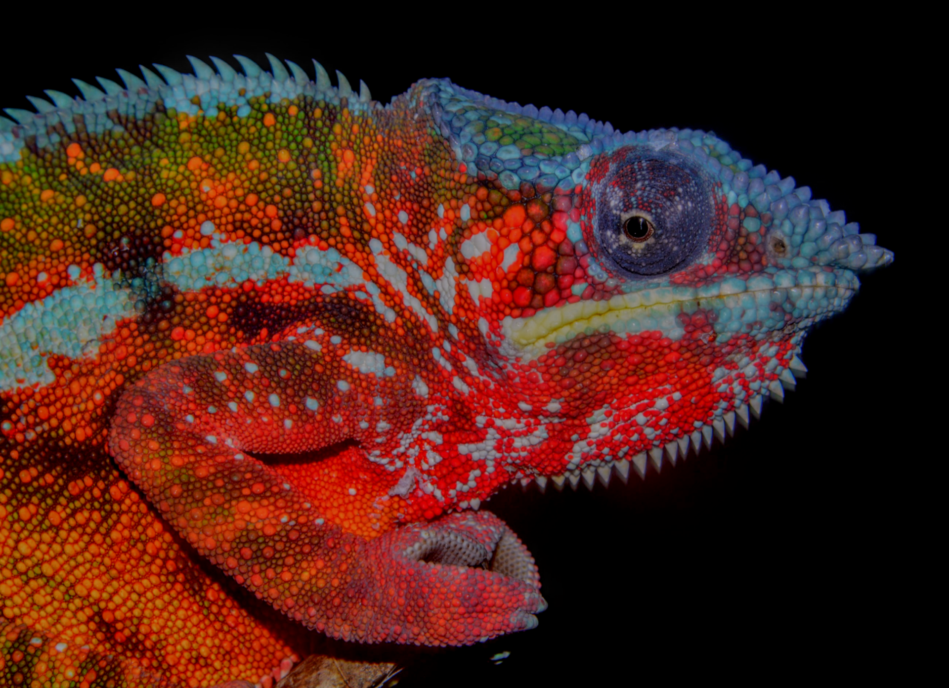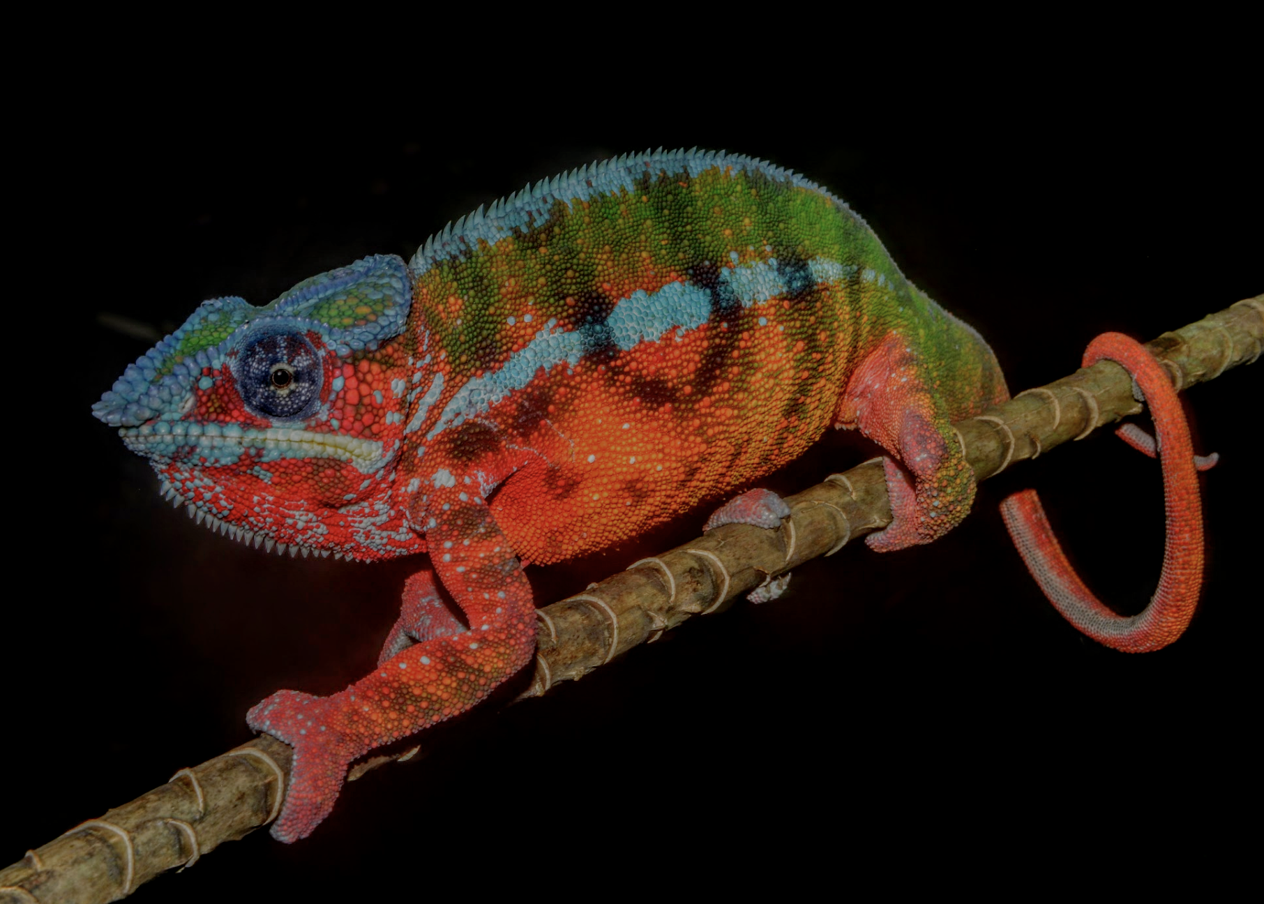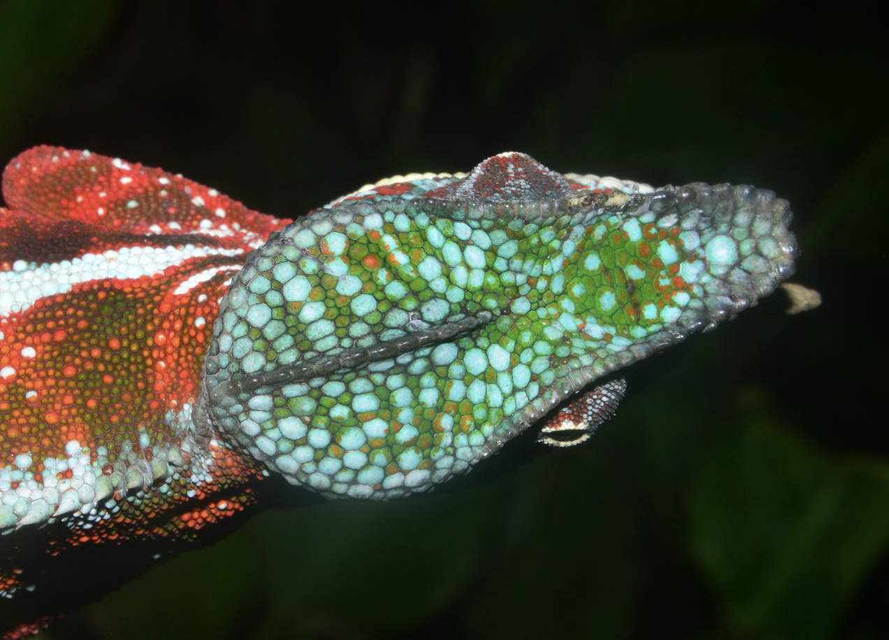 Among the most striking local forms of Furcifer pardalis, the Beforona population radiates an extraordinary palette that remains little known. Males display a vivid orange‑red belly, contrasting with greenish upper flanks that shimmer under forest light. A crisp white dorsal crest and a delicate white strike across the flanks add sculptural definition, while the top of the head glows green, scattered with iridescent blue dots. This ensemble creates a living mosaic—an enigmatic beacon of Madagascar's chromatic diversity.