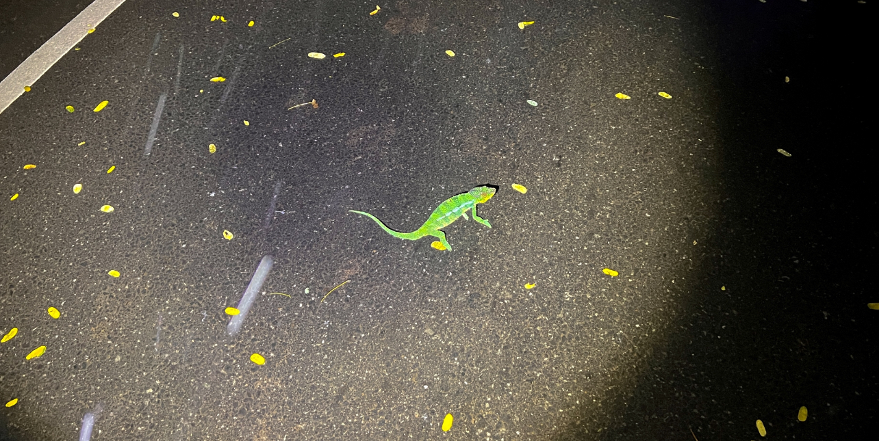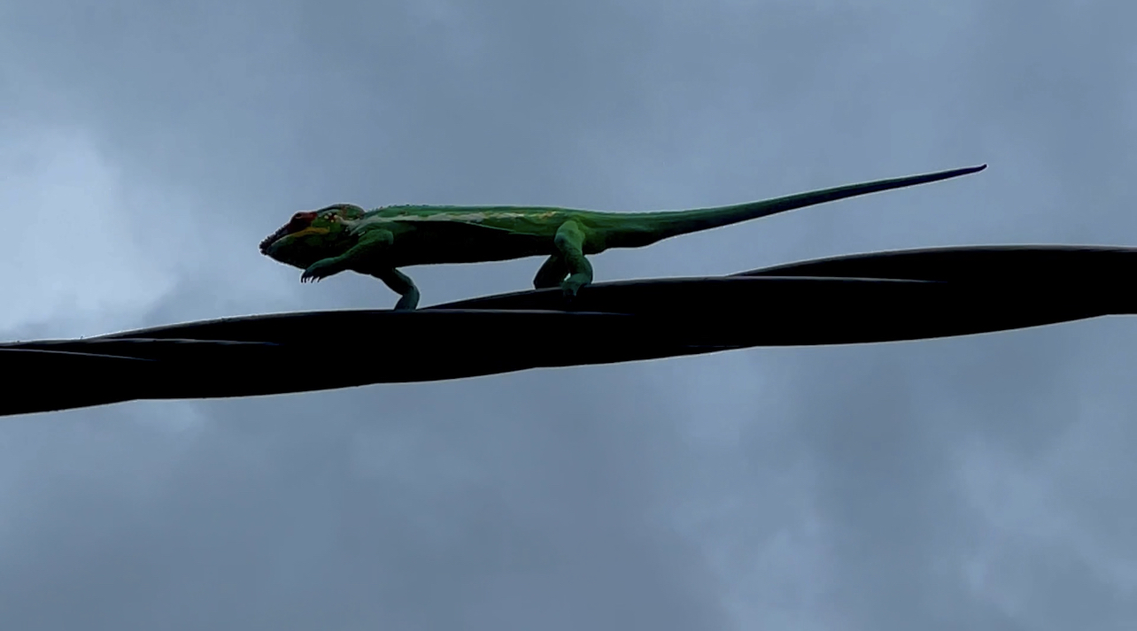 Occasionally, however, they are triggered to relocate. The reasons vary: a decline in food availability, shifts in thermal conditions, or the search for a sexual partner. When this happens, chameleons seek out what might be called "corridors" to move between habitats. The most common route is to descend to the ground and cross to another tree or patch of vegetation. Yet, in human‑altered landscapes, they sometimes adopt unusual pathways — for example, climbing along electric wires, asphalt roads or other artificial structures that connect vegetation.